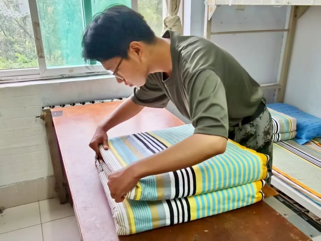 训练过程中,新生们以高标准严格践行内务规范,将整理细节落到实处。铺展床单时,大家反复抚平边角,确保床面平整如镜,无一丝褶皱;叠放被子时,精准丈量线条、仔细抠捏棱角,将被子叠成方方正正的“豆腐块”,尽显规整利落。