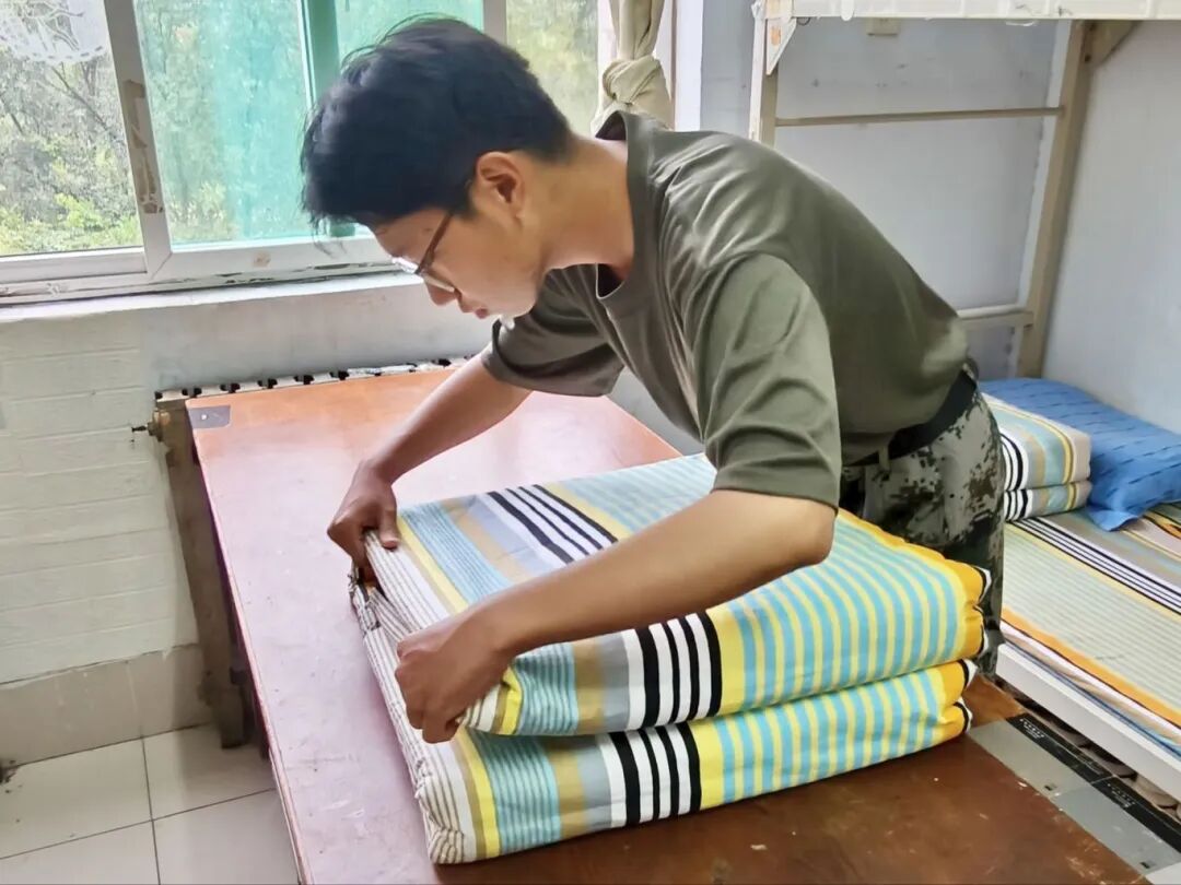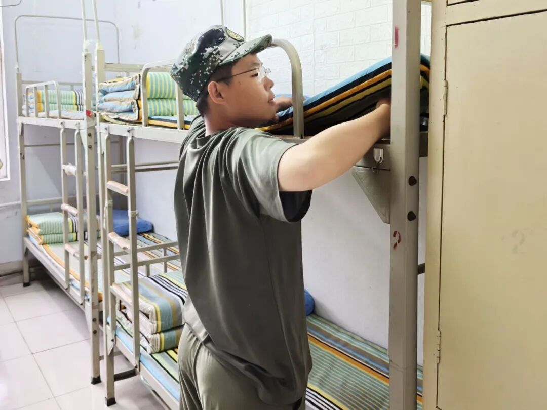 叠被子时,他们将被角捏出笔直的线条,把“豆腐块”的标准贯彻到底;整理内务时,物品摆放错落有致、棱角分明。他们用指尖反复捏塑被角的线条,用尺子比对物品摆放的间距。从起初的手忙脚乱到后来的有条不紊,物电学子在一次次的内务整理中,练就了细致入微的观察力与说到做到的执行力。这份对“规范”的坚守,既是对军营作风的践行,更是在细节处培养自律习惯,让严谨自律的态度融入日常,为即将开启的大学生活奠定扎实的素养基础。