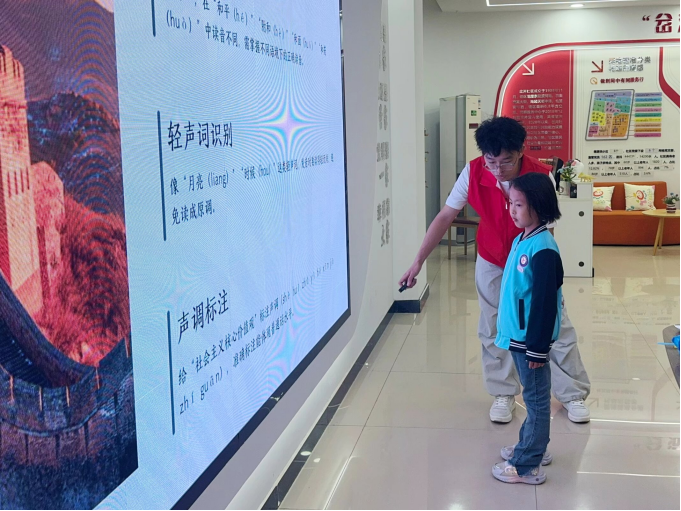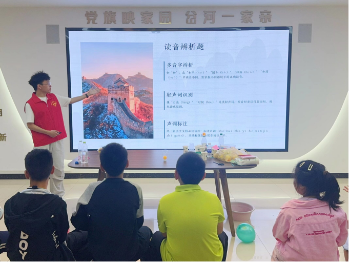活动中,志愿者围绕“语言教学”与“价值观引导”两大核心环节层层推进。他们首先对普通话的定义与推广意义进行了阐释以帮助孩子们建立基础认知,随后拆解声母韵母的正确读法聚焦发音核心要点,最后对词语规范运用进行了指导,以实现从基础发音到实际表达的过渡,让小朋友们沉浸式感受普通话的语言魅力。同时,志愿者创新采用领读、互动接龙、分组竞赛等形式,引导小朋友们背诵社会主义核心价值观,并结合贴近儿童生活的简单案例解读其内涵,让小朋友们在规范语言表达的同时,自然厚植家国情怀、强化民族团结意识。
